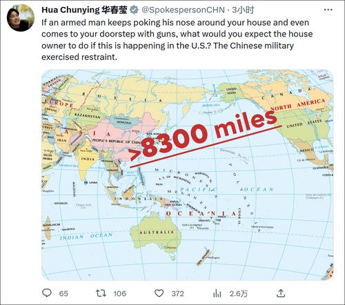 在另一条推文中,华春莹晒出了一张世界地图,标明中国与美国相距8300英里(约13357公里)之遥。