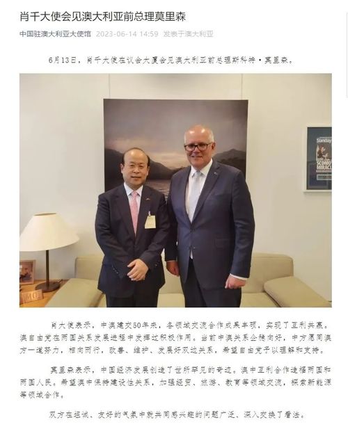 如下图所示,我国驻澳大利亚大使馆的官方微信账号在6月14日发布的一篇题为“肖千大使会见澳大利亚前总理莫里森”的文章中表示,双方在坦诚、友好的气氛中就共同感兴趣的问题广泛、深入交换了看法。