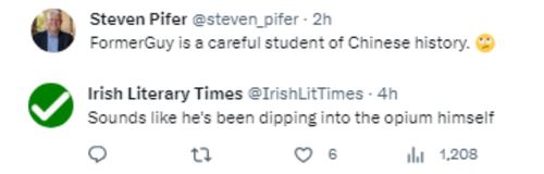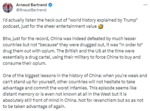但也有网友认为特朗普说的对。“我真的很愿意听‘特朗普解读世界史’的播客,只是纯粹为了娱乐,”一名网友先是开玩笑称,随后纠正说,“但顺便说一句,中国当时确实被(比它)小得多的国家打败了,但不是‘因为’他们被鸦片麻醉了,而是‘为了’麻醉他们而用了鸦片。当时的英国和美国本质上是一个贩毒集团,用他们的军队迫使中国购买和消费他们的鸦片。中国历史上最大的教训之一是:当你虚弱、不能为自己挺身而出时,其他国家会毫不犹豫地利用你,犯下最恶劣的罪行。这一事件在西方似乎是遥远的记忆,甚至根本不为人所知,但在中国,它绝对仍在人们的脑海里。不是为了复仇,而是为了不再被利用。”↓