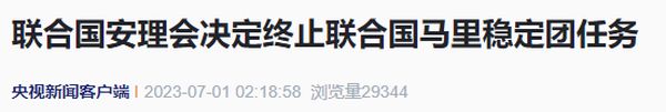根据联合国网站6月30日消息,联合国安理会于当天通过一项决议,决定终止联合国马里稳定团的任务,该决议自6月30日起生效。