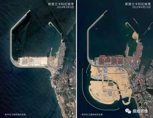2014年3月(左)与2022年4月斯里兰卡科伦坡港所在地卫星图。图自光明网