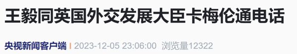 2023年12月5日,中共中央政治局委员、外交部长王毅应约同英国外交发展大臣卡梅伦通电话。……