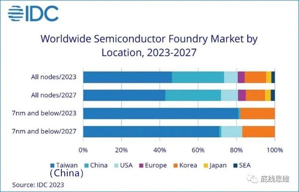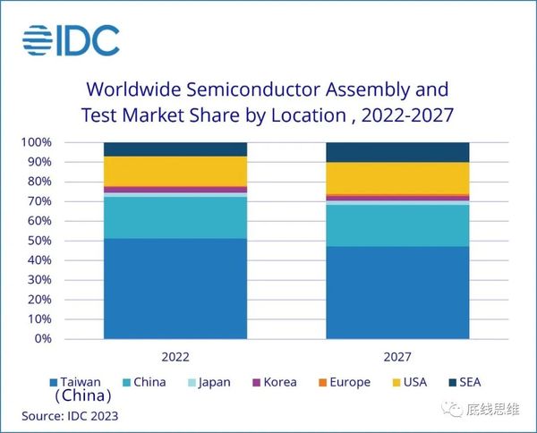 国际数据资料公司(IDC)10月份的报告(注3)预测,到2027年,中国与中国台湾将占据72%的代工市场和68%的封测市场。