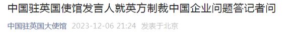 使馆发言人:我们坚决反对英方违反国际法、滥用单边制裁、损害中国企业正当权益的行径,已向英方提出严正交涉。