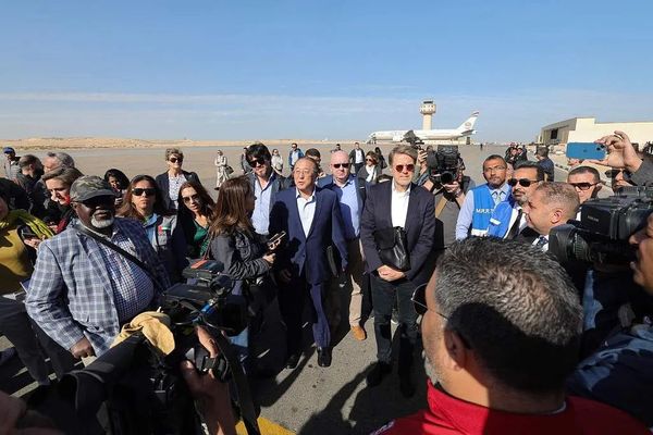 当地时间2023年12月11日,拉法口岸,联合国安理会成员国特使团在前往拉法之前抵达阿里什。(视觉中国)
