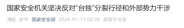 面对台湾地区两项选举后的台海局势,国家安全机关将深入贯彻落实党中央决策部署,服务中央对台工作大局,精准打击遏制“台独”分裂势力,坚决反制外部势力干涉台海问题,决不会坐视国家主权、安全、发展利益受损,决不会允许任何人任何势力侵犯和分裂中国的神圣领土。若“台独”分裂势力和外部干涉势力胆敢挑衅,国家安全机关将严格按照党中央决策部署,予以迎头痛击。