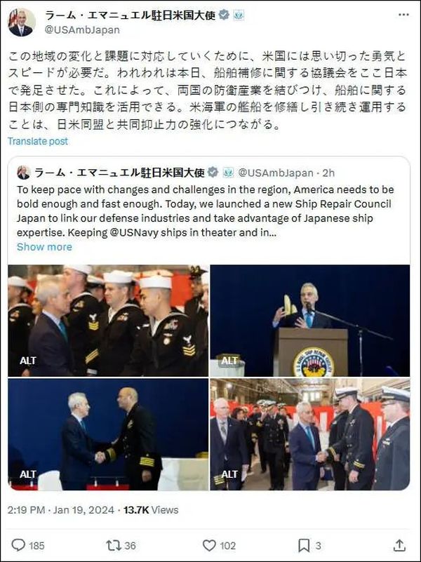 伊曼纽尔19日访问了东京附近的驻日美军横须贺基地,并在社交平台X(原推特)上发布相关照片。他在配文中宣布,美日已启动了一个新的“日本船舶维修理事会”,以连结两国的国防工业,利用日本的船舶专业知识为美国海军战舰提供维修,“加强美日联盟及其联合威慑力量”。
