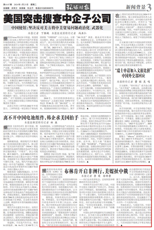 至于美国官方和媒体在谈到布林肯此访意图时的不同说法,外交学院教授李海东22日对《环球时报》记者表示,近几年,随着美国着眼于大国竞争的大战略,才把非洲当作其重点拉拢的对象,美国对非洲的外交带有很强的投机性,而媒体则更强调本质。如果美国官方在对非交往中明确表态着眼于对华对俄竞争,那么非洲国家很大可能会与美国保持距离,因此美方会使用易于为非洲国家接受而不引起反感的表述或者是话术,但这掩盖不了美国政府的对非政策实质是试图将非洲变为另外一个大国角斗场。