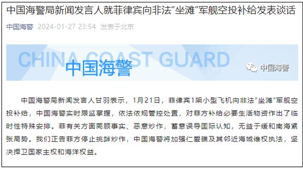 据微信公众号“中国海警”1月27日消息,中国海警局新闻发言人甘羽表示,1月21日,菲律宾1架小型飞机向非法“坐滩”军舰空投补给,中国海警实时跟监掌握,依法依规管控处置,对菲方补给必要生活物资作出了临时性特殊安排。菲有关方面罔顾事实、恶意炒作,蓄意误导国际认知,无益于缓和南海紧张局势。我们正告菲方停止挑衅炒作,中国海警将加强仁爱礁及其邻近海域维权执法,坚决捍卫国家主权和海洋权益。