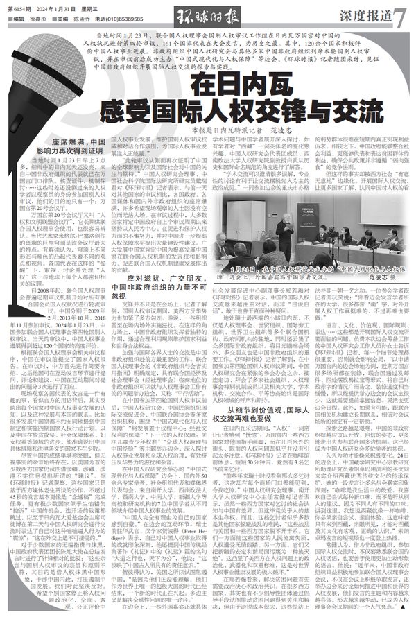 当地时间1月23日,联合国人权理事会国别人权审议工作组在日内瓦万国宫对中国的人权状况进行第四轮审议,161个国家代表在大会发言,为历史之最。其中,120余个国家积极评价中国人权事业进展。非政府组织中国人权研究会与其他多家中国非政府组织列席本轮国别人权审议,并在审议前后成功主办“中国式现代化与人权保障”等边会,《环球时报》记者随团采访,见证中国非政府组织开展国际人权交流的探索与实践。