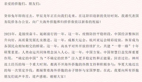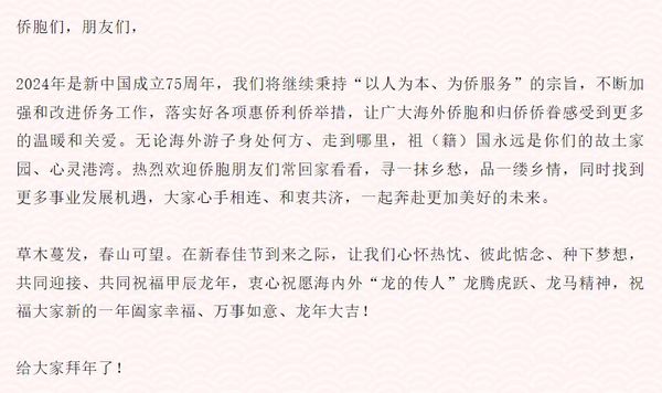 祝愿“龙的传人”龙年大吉!国侨办主任陈旭给您拜年啦~