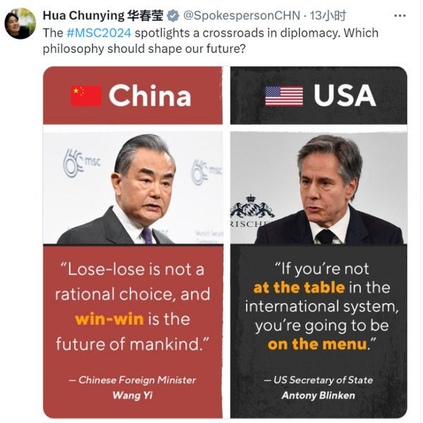 “2024慕尼黑安全会议凸显外交的十字路口。哪种哲学应该塑造我们的未来?”刚刚结束不久的第60届慕尼黑安全会议聚焦全球目光,面对中美两国最高外交官向世界发出的不同声音,中国外交部部长助理、发言人华春莹22日在社交平台X上这样发问。