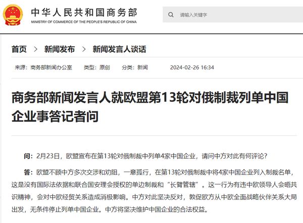 商务部新闻发言人就欧盟第13轮对俄制裁列单中国企业事答记者问