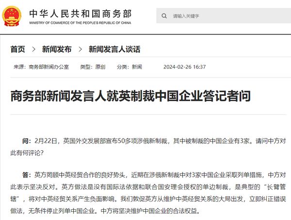 问:2月22日,英国外交发展部宣布50多项涉俄新制裁,其中被制裁的中国企业有3家。请问中方对此有何评论?