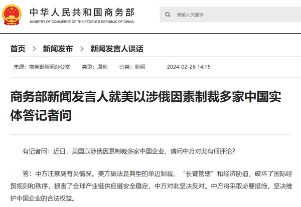据商务部网站26日消息,商务部新闻发言人就美以涉俄因素制裁多家中国实体答记者问。
