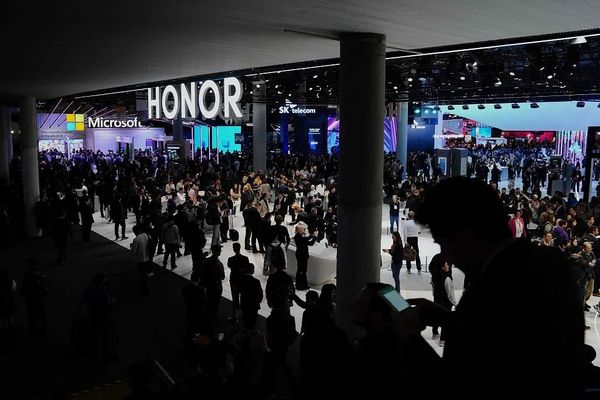 当地时间2024年2月26日,西班牙巴塞罗那,在世界移动通信大会(MWC)上,与会者参观中国制造商荣耀手机的展台。图源:视觉中国