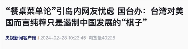 文章导读 “餐桌菜单论”引岛内网友忧虑 国台办:台湾对美国而言纯粹只是遏制中国发展的“棋子”2月28日,国务院台办举行例行新闻发布会。……