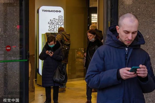 2022年3月3日,俄罗斯民众在莫斯科的TINKOFF银行自动取款机前排队取美元 图自视觉中国