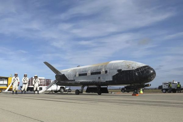 (具体拍摄时间不详)美国佛罗里达州,肯尼迪航天中心,一架X-37B“轨道实验飞行器”。美国军方的X-37B“轨道实验飞行器”于2023年12月28日升空,执行一项秘密任务,预计将持续至少几年。(图源:视觉中国)