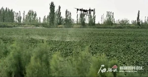 2023年9月19日,尉犁县“极飞科技”智慧农业示范基地的3000亩“超级棉田”,无人机在给棉田喷洒防虫药。天山网-新疆日报记者 约提克尔·尼加提 摄
