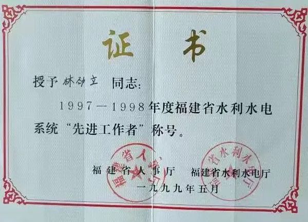 林劲立荣获1997-1998年度福建省水利水电系统“先进工作者”称号奖状