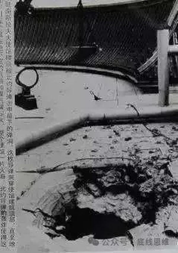 图为中国驻南联盟大使馆楼顶被北约导弹击中后留下的弹洞,这枚导弹洞穿使馆建筑顶部,直至地下室