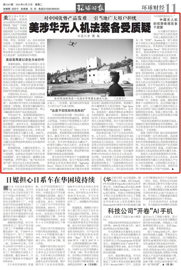 香港《南华早报》援引美国道琼斯工业平均指数一名代表的话称,该法案如果通过,将开创允许毫无根据的指控和仇外恐惧情绪推动公共政策决策的先例,对公共安全和美国经济产生负面影响。据《纽约时报》报道,目前约58%的美国无人机运营商在使用大疆无人机。