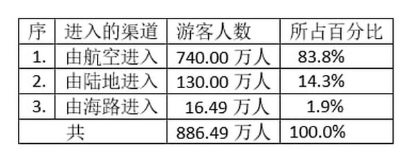 这期间通过航空渠道进入越南的国外游客占游客总数的83.8%的比例(人数740万人),由陆地进入的游客占游客总数14.3%的比例(人数130万人),而由海路进入的游客占游客总数 1.9%的比例(人数164,900人)。