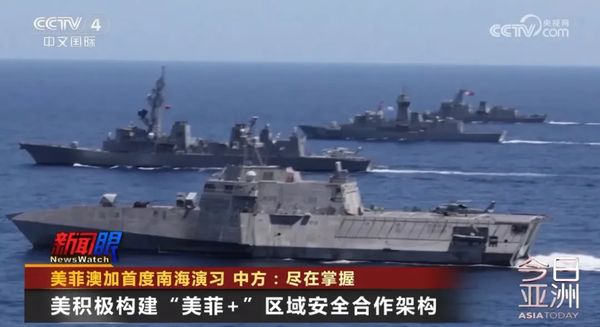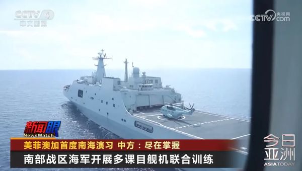 8月7日,美菲澳加4国部队首度在南海开展海空联合演习。同一天,中国人民解放军南部战区位南海海域组织联合海空战巡,南部战区指出,一切搅局南海、制造热点的军事活动尽在掌握。