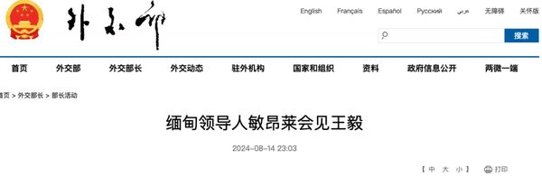 当地时间2024年8月14日,缅甸领导人敏昂莱在内比都会见中共中央政治局委员、外交部长王毅。
