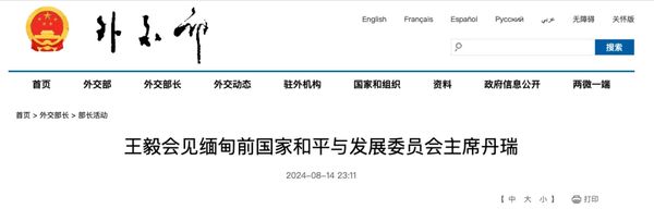 当地时间2024年8月14日,中共中央政治局委员、外交部长王毅在内比都会见缅甸前国家和平与发展委员会主席丹瑞。