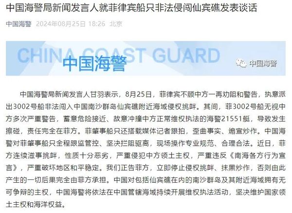 中国海警局新闻发言人甘羽表示,8月25日,菲律宾不顾中方一再劝阻和警告,执意派出3002号船非法闯入中国南沙群岛仙宾礁附近海域侵权挑衅。其间,菲3002号船无视中方多次严重警告,蓄意危险接近、故意冲撞中方正常维权执法的海警21551艇,导致发生擦碰,责任完全在菲方。菲肇事船只还搭载媒体记者跟拍,歪曲事实、煽宣炒作。中国海警对菲肇事船只全程跟监管控、坚决拦阻驱离,现场操作专业规范、合理合法。