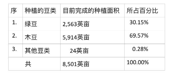 目前本漂县区内各种豆类完成的种植面积如下表: