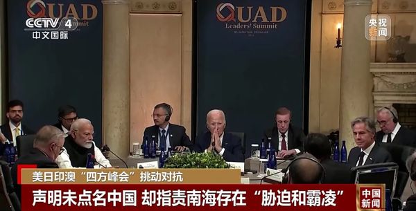 据法新社报道,“四方峰会”在会后发表的联合声明中,尽管没有点名中国,但指责南海海域存在“胁迫和霸凌”。联合声明还宣布明年将举行四方海岸警卫队联合巡航行动,计划扩大“印太海域意识伙伴关系”。联合声明还指责朝鲜发射导弹和进行网络攻击,对俄罗斯与朝鲜的军事合作表示担心。