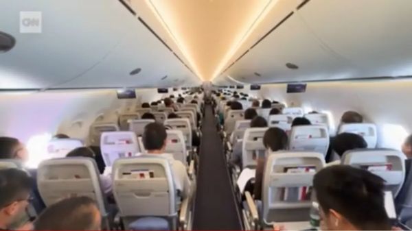 史蒂文拍摄的C919客舱内部(视频截图)美国有线电视新闻网(CNN)