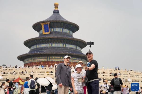 四名来自瑞士的游客在北京天坛公园祈年殿前合影。资料图:新华社