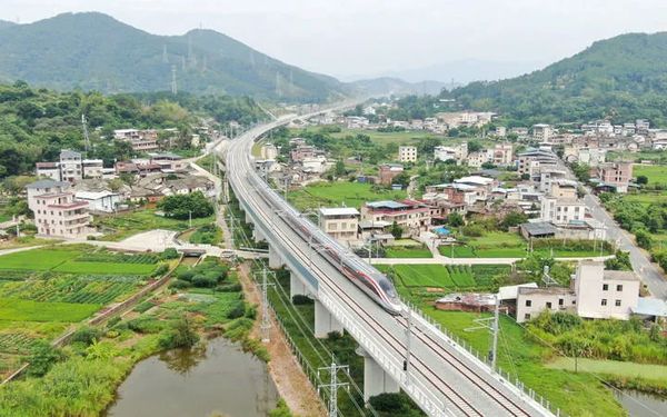 2024年9月13日,复兴号试验列车行驶在龙龙高铁梅龙段叶屋特大桥上。资料图:新华社