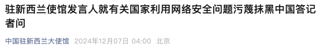 问:近日,新西兰国家网络安全中心和美国等伙伴国家相关机构针对“与中国有关联的网络间谍活动”联合发布强化通信基础设施网络安全防护指南。中国驻新使馆对此有何回应?
