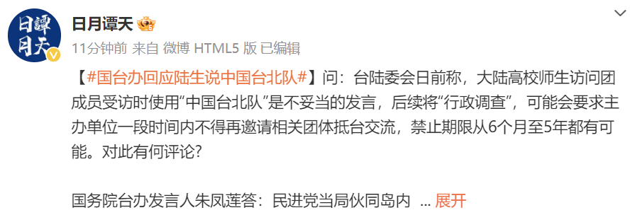 问:台陆委会日前称,大陆高校师生访问团成员受访时使用“中国台北队”是不妥当的发言,后续将“行政调查”,可能会要求主办单位一段时间内不得再邀请相关团体抵台交流,禁止期限从6个月至5年都有可能。对此有何评论?