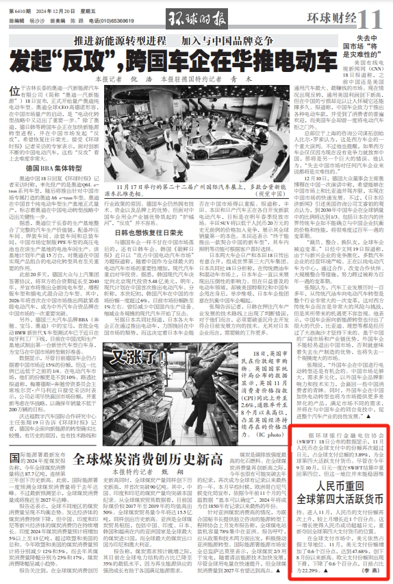 据环球银行金融电信协会(SWIFT)18日公布的数据显示,11月人民币在全球支付中的份额再次超过日元,占全球支付总额的3.89%,为全球第四大活跃支付货币。尽管在今年9至10月,日元一度在SWIFT结算中重回第四位,但这一地位并未能稳固维持。进入11月,人民币的支付份额再次上升,较上月增长近1个百分点。这一增长使得人民币成功超越日元,重新夺回全球第四大支付货币的位置。