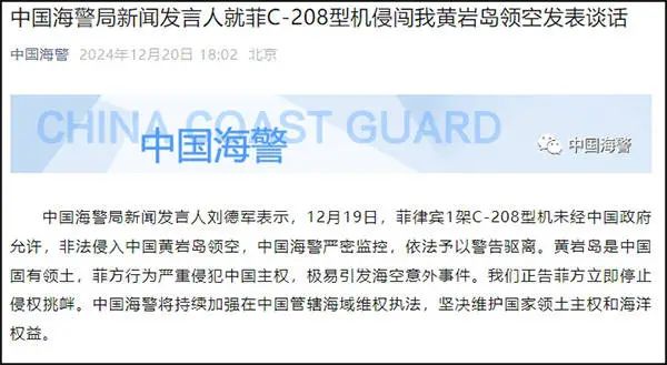 据微信公众号“中国海警”12月20日消息,中国海警局新闻发言人刘德军表示,12月19日,菲律宾1架C-208型机未经中国政府允许,非法侵入中国黄岩岛领空,中国海警严密监控,依法予以警告驱离。黄岩岛是中国固有领土,菲方行为严重侵犯中国主权,极易引发海空意外事件。我们正告菲方立即停止侵权挑衅。中国海警将持续加强在中国管辖海域维权执法,坚决维护国家领土主权和海洋权益。