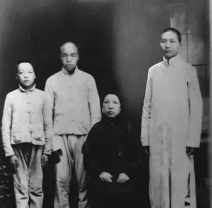 1919年,毛泽东(右一)与母亲文七妹、弟弟毛泽民(左二)、毛泽覃(左一)