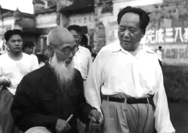 1959年,毛泽东回到韶山,这是他自1927年离开韶山后第一次故园行,他与少年时代的启蒙老师毛宇居携手而行