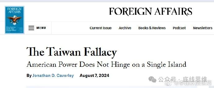 8月,美国海军战争学院作战研究系教授Jonathan Caverley在外交事务网站上发表文章,题为“台湾谬误”(The Taiwan Fallacy),副标题是“美国实力并不取决于一个岛屿”。