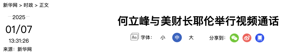 中美经贸中方牵头人、国务院副总理何立峰与美方牵头人、财政部部长耶伦于1月7日举行视频通话,双方围绕落实中美元首重要共识,回顾总结近年来中美经济领域交往合作经历,积极评价中美经济、金融工作组等对话机制的重要作用,同意在过渡期内保持沟通、管控分歧,继续稳定中美经济关系……