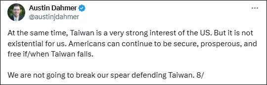 他在X平台上说,“台湾的确是美国的重大利益所在,但并非生死攸关。即使台湾‘失守’,美国民众仍能继续安全、繁荣且自由地生活。”