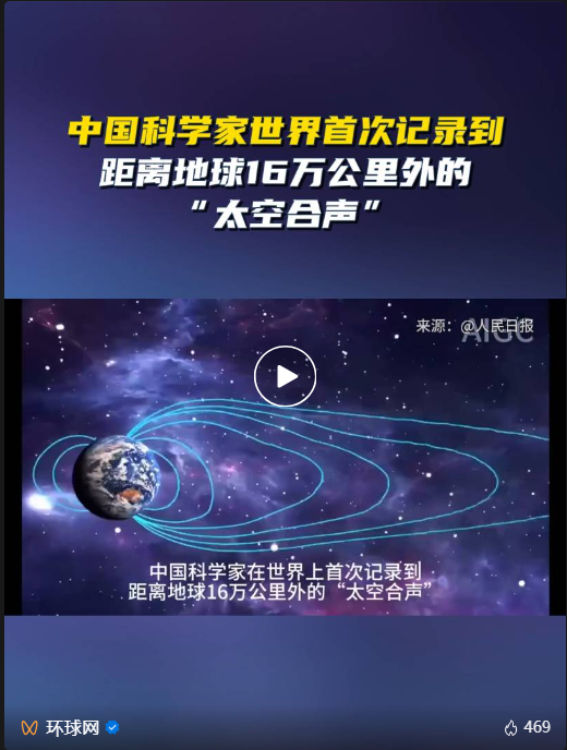 据介绍,地球的磁场深入太空,磁力线受到宇宙空间带电粒子等扰动时,会激发频率特征类似清晨鸟儿齐鸣合声的电磁波,科学界称为合声波。合声波是太空中幅值最强的电磁波动之一,自上世纪50年代以来一直是空间物理学研究的前沿热点,但过去通常认为它只出现在靠近地球的偶极磁场区域。