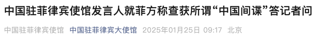 中国驻菲律宾使馆驳斥菲方言论:所谓中国公民在菲从事“间谍”活动纯属诬蔑抹黑……