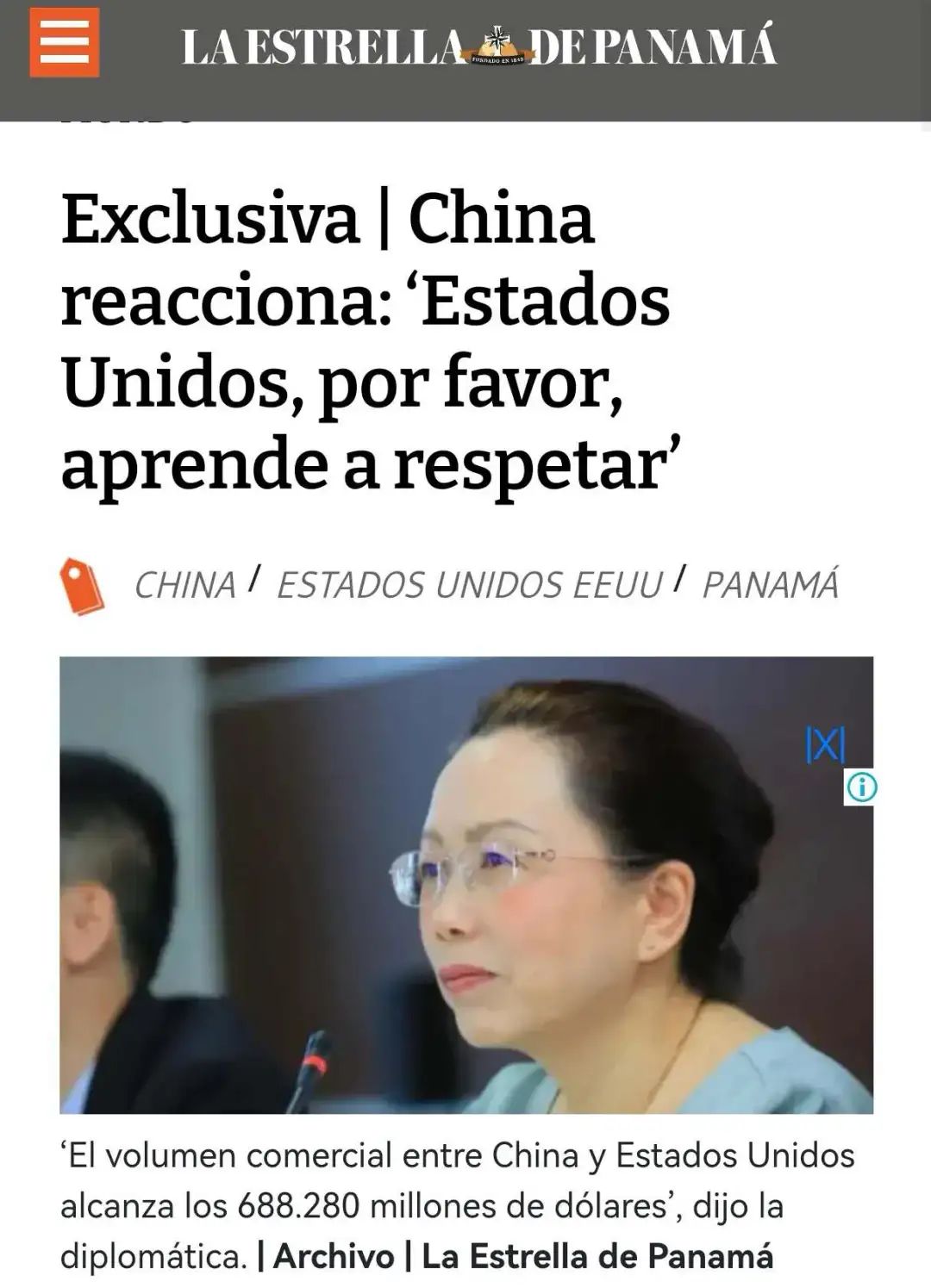 3日,中国驻巴拿马大使徐学渊在巴当地报纸《星报》上发文阐明中国基于平等、尊重、互利原则发展同巴拿马的关系。中国尊重运河永久中立。文章还指出,对运河构成威胁的是美国,并写道:“在国际社会中,所有国家一律平等,都有自主发展外交关系的权力,谁也没有资格对他国颐指气使,发号施令。美国要创造美洲的黄金时代,首先得尊重其他国家,问一问拉美人民想要一个什么样的时代。”