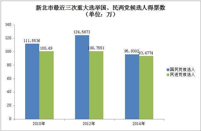 上图是2010年台湾“五都”选举、2012年台湾领导人选举和本次县市长选举国、民两党候选人在新北市的得票数。从中可以看出,2010年新北市长选举和2012年台湾领导人选举,蔡英文在新北的得票数都在100万到101万之间,而本次选举,民进党籍新北市长候选人游锡堃的得票数为93.5万,比蔡英文此前两次的得票数要低。这正证明了前述判断,民进党并不那么受欢迎,但不满国民党施政的选民更多。